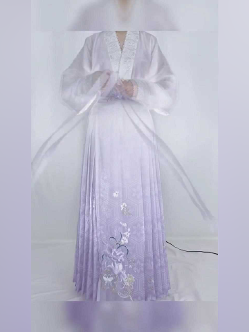 淡粉、烟蓝、浅紫等低饱和色系,能衬托肤色并强化温婉书卷气。天蓝色对襟襦裙以海浪绣花点缀,裙摆垂坠如烟,行走间尽显飘逸仙韵24。